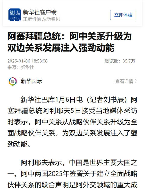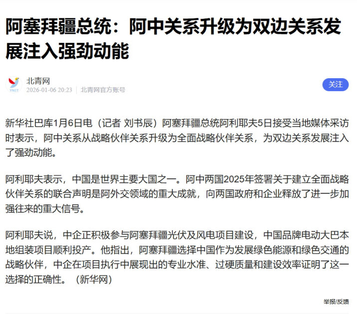 "When we decided to develop not only green energy but also green transport, we had to choose a strategic partner, and the choice fell on Chinese companies," President Aliyev said. He added that the professionalism, quality and speed of execution of these projects "have confirmed the correctness of this choice."